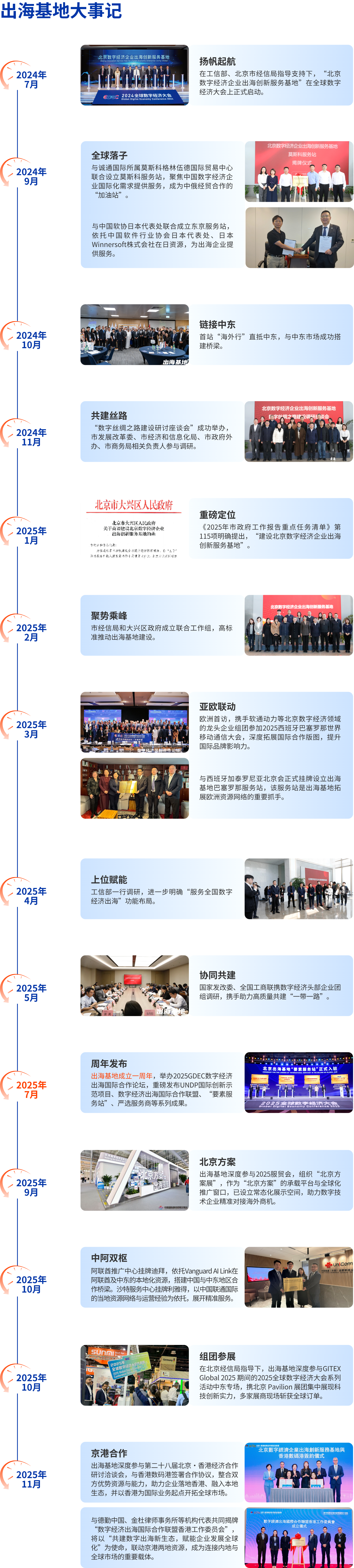 The Beijing Go Global Hub for Digital Enterprises("Beijing Go Global Hub") was officially launched on July 3, 2024 at the Global Digital Economy Conference 2024 under the guidance of the Ministry of Industry and Information Technology of the P.R.C. and the Beijing Municipal Bureau of Economy and Information Technology. It has been included as the 115th key task in the 2025 Beijing Municipal Government Work Report and has become a new "brand" in the "one district, one brand" initiative of Beijing's digital economy, specifically in Daxing District. The Beijing Go Global Hub is positioned as the first government-led, market-driven, one-stop service platform for digital ecosystem going global. Besides, it is an important part of construction of Beijing as a model city of global digital economy and an important place for the creation of the "Digital Silk Road" Economic Cooperation Pilot Zone. By integrating full-stack ecological resources going global, the hub is dedicated to accelerating the formation of eight core services (space carrier services, business opportunity information services, two-way policy services, ecosystem selection services, overseas promotion services, compliance assurance services, brand empowerment services, and international talent services). It aims to build "four highlands and one cluster" (policy innovation highland, ecological service highland, overseas order highland, compliance supervision highland, and export-oriented digital economy industrial cluster), becoming the first station for Beijing-Tianjin-Hebei enterprises to "go global" and the first station to "bring in" foreign investment.